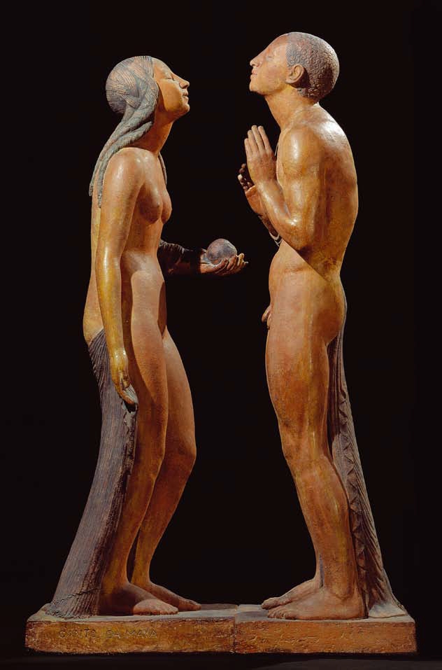 A policromia, inédita na escultura da época, reforça este aspecto. O modelado dos corpos é uniforme e exibe nos cabelos e nas pregas do panejamento um esquematismo caracteristicamente art déco. Um ondulado sensual percorre os corpos extasiados que, voltados frente a frente, se alheiam do espectador revelando os perfis ou as costas. Este aspecto confere ao espaço interior uma dimensão íntima, quase táctil na configuração da posição das mãos das figuras, e concentra a atenção no elemento de maior pregnância simbólica constituído pelo fruto oferecido e que actualiza o mito do pecado original pressuposto no incontido sensualismo da composição. Esta metaforiza o espaço vazio entre ambas as figuras em forma de chama.