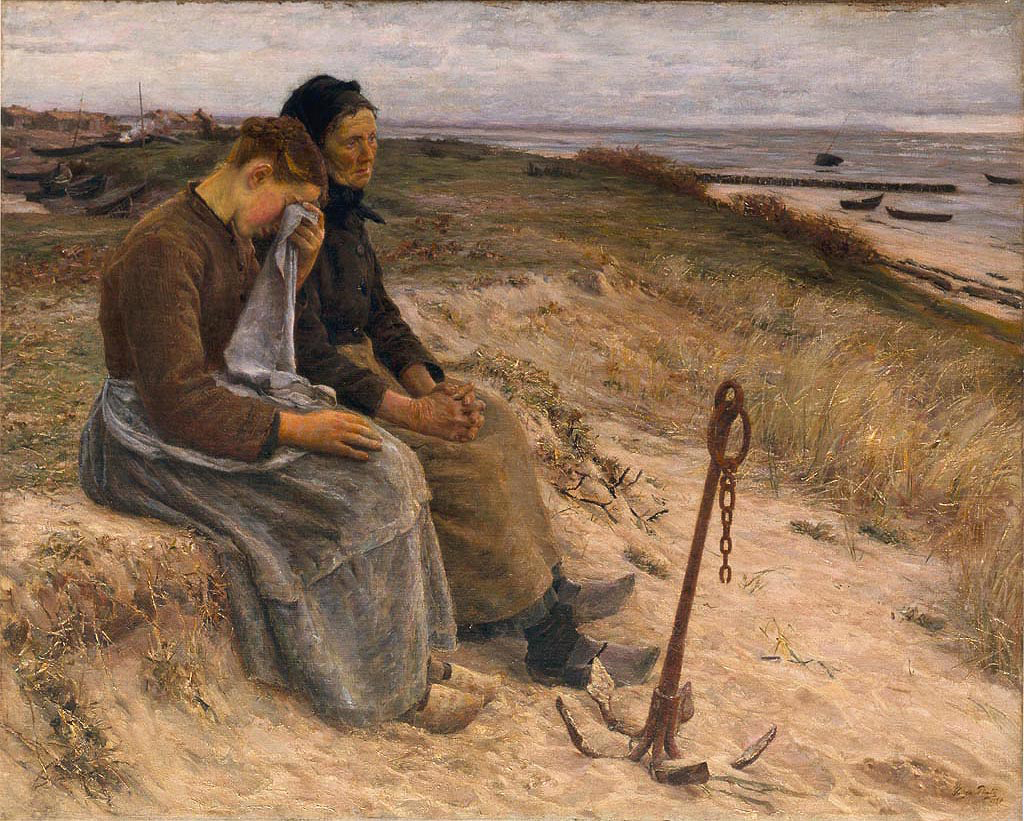 O tema, sombrio pela dramaticidade sentimental e algo cenográfica dada à disposição das figuras e dos signos que o identificam (destroços do barco e âncora), remete para uma lamentada tradição marítima, representada pelas mulheres de pescadores, provavelmente da costa da Bretanha.