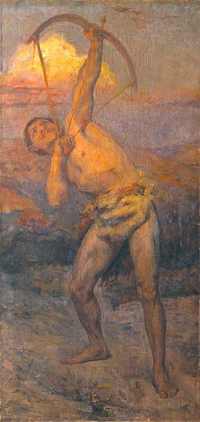 Esta tela foi enviada para Portugal durante a frequência do 2º ano de pensionato em Paris e destinava-se a integrar um conjunto decorativo nunca efectuado. A temática e a observação do traje referem, possivelmente, algumas representações do pintor de História, seu mestre e amigo, Fernand Cormon (Cain; Retour d’une chasse à l’ours, à l’ âge de pierre), mas a composição introduz valores de uma estética pós-impressionista de envolvência simbolista. Embora a plasticidade corpórea denote uma tendência naturalista, a sua postura aponta um ‘objecto’ ausente, denunciado na atitude concentrada da personagem. O olhar fita o transcendente, aproximando-se de um ideário simbólico-espiritualista inspirado nos Nabis  num intimismo e contenção expressiva. A sinuosidade da figura acentua-se na iluminação do tronco por uma luz difusa, enquanto a cabeça e pernas permanecem na sombra. O fundo, tratado em pequenas pinceladas verdes, laranjas e violetas revela um conhecimento e estudo das práticas pós-impressionistas, num divisionismo da luz em ‘impressões’ sensoriais. Trata-se de uma ordenação orgânica da cor que desmembra uma envolvência e contrasta com a pincelada lisa utilizada na pele morena – é uma madrugada clara onde o sol desponta em explosões de amarelos e laranjas. Uma cortina terrosa e acinzentada é o elemento mediador entre a cena e o espectador. Obra de início da sua carreira, O Caçador de Águias foi pretexto para a utilização de novas técnicas, reflexo da observação atenta do meio parisiense. A experiência oscila entre uma aprendizagem académica e vias pós-impressionistas ou simbolistas, revelando valores luminosos.