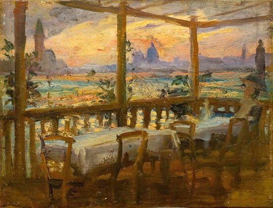 Memória iconográfica de Veneza, esta peça complementa o anterior número deste catálogo. A laguna surge através de pequenas pinceladas, fortemente texturadas, resultantes da influência do meio parisiense, nomeadamente de Claude Monet e de Émile Besnard. Amigo deste último, Sousa Lopes considera-os, em carta enviada à Academia, os “mestres da luz”. O céu desmembra-se em azuis e rosas que na laguna se reflectem e misturam-se com manchas esverdeadas. Uma envolvência de efeitos de sol poente resulta de um jogo entre coloridos intensos e a captação da estética italianizante do tratamento da luz, rapidamente apreendida pelo olhar atento do autor. Aliás, é a importância deste estudo que constitui pretexto da viagem, em 1906, como o indica outra carta para a Academia Nacional de Belas-Artes: “os estudos escolares são insuficientes”. A composição planificada encontra na estrutura de uma das muitas esplanadas desta área, em castanhos fortes, a marcação de um plano anguloso, auxiliar de uma visão alargada de ‘grande angular’. Uma figura feminina de chapéu, sentada a uma mesa, indefinida pela pincelada sintetizada, parece admirar a paisagem do Mar dos Teatros onde se recortam os edifícios da Ilha de San Giorgio, à esquerda, Veneza, em frente e a Dogana, à direita.