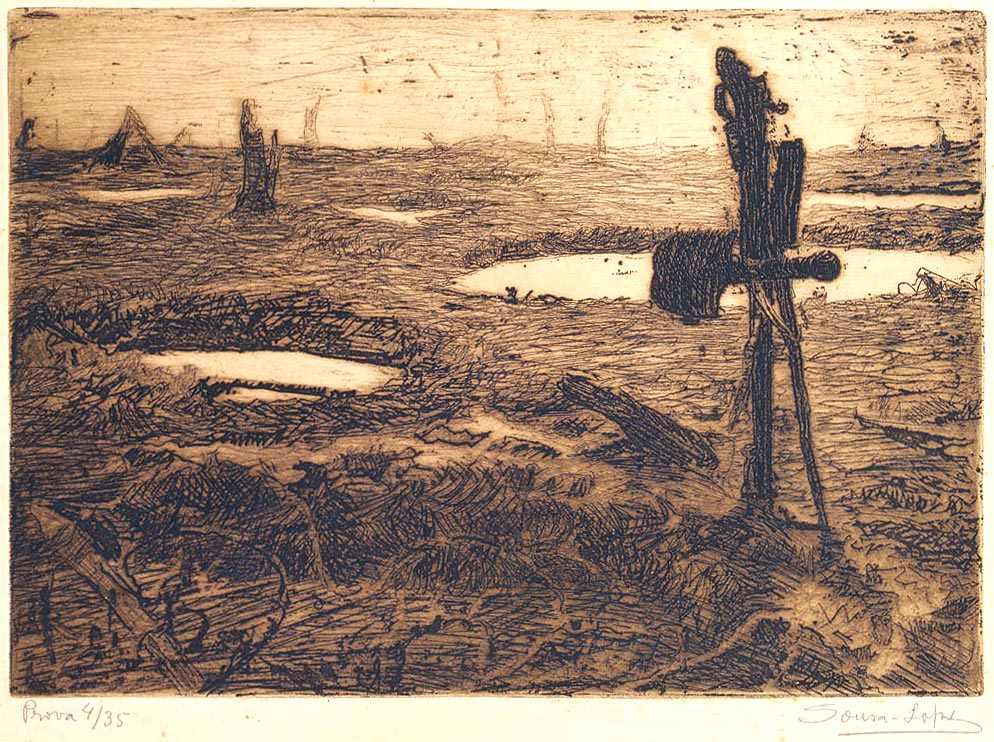 Artista enviado para a frente de batalha, em 1917, Sousa Lopes capta a dramaticidade da participação portuguesa na Primeira Guerra Mundial, numa situação comum a artistas de outras nacionalidades, traduzindo, através da imagem, as ideias de heroicidade e de patriotismo ligadas a um desejo de registo da violenta e surpreendente «espectacularidade» da guerra. O historial emotivo destas crónicas de guerra, registadas em pintura, desenho e gravura, revela expressivas despedidas de soldados, mães chorosas, marchas fatigantes, refeições de rancho, mas, essencialmente, bombardeamentos, cenários de mortes e cemitérios. Estes dramáticos instantâneos de Sousa Lopes, captados no local, foram posteriormente desenvolvidos e aprofundados, cerca de 1918, num casarão de Boulevard Victor, na periferia de Paris.