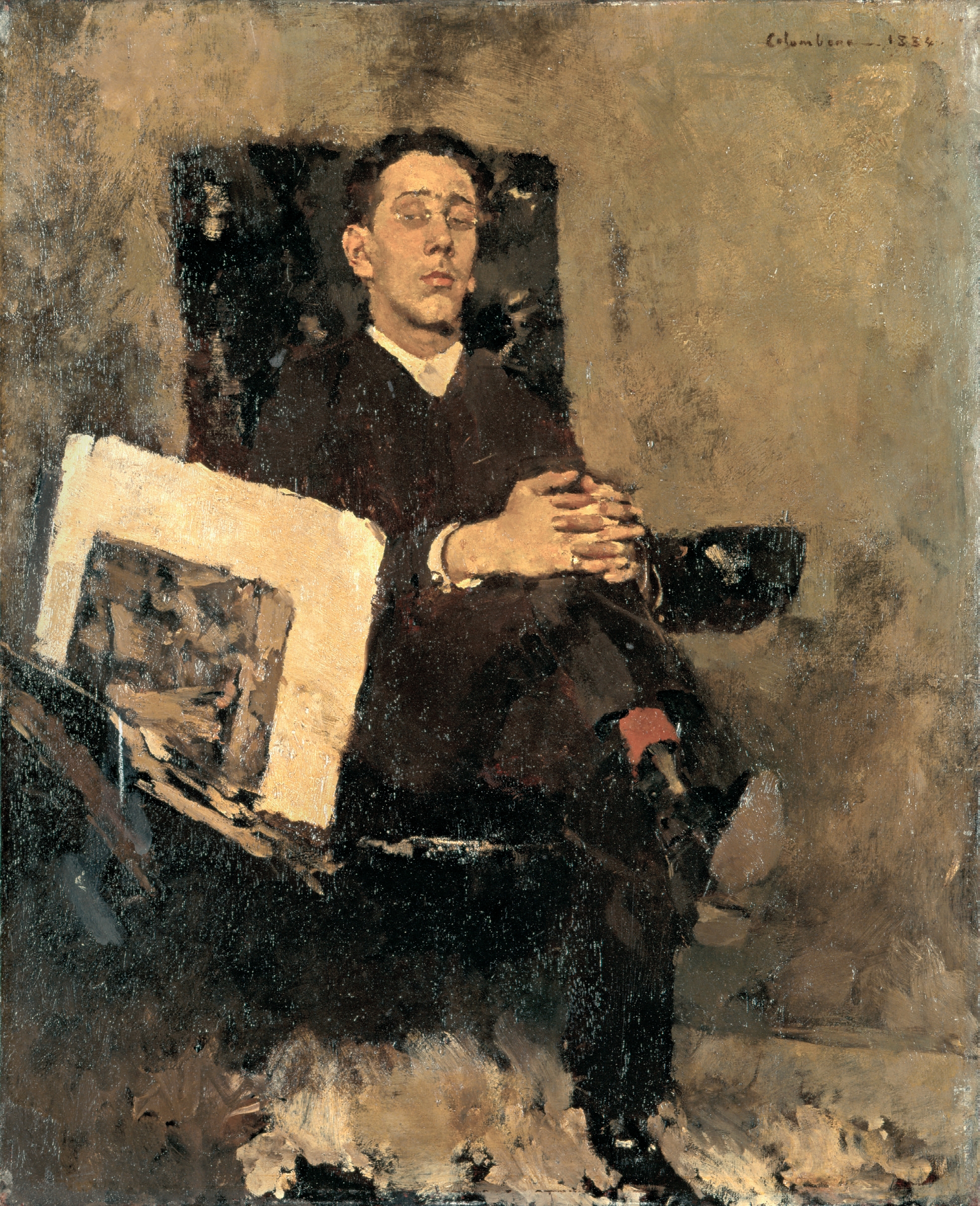 O Retrato de Manuel Gustavo Bordalo Pinheiro, sobrinho, do artista filho de Rafael, apresenta uma construção expressiva que é levada ao seu extremo através da autonomia da mancha cromática sem contornos desenhados. Dando continuidade aos fundos claros abstractos nos quais se recorta a figura mais escura, Columbano trabalha a indefinição geral dos planos confundindo chão e paredes, agora sem os subterfúgios naturalistas da sombra e da penumbra como ainda acontecia em O Concerto de amadores. Apenas o rosto apresenta ainda um acabamento ligeiramente mais contrastante com o esboçado geral. A meia vermelha, bem como a dimensão das mãos entrelaçadas suportando o joelho, remetem para um primeiro plano. Aspectos do corpo, tradicionalmente secundarizados relativamente ao rosto, no retrato, e que inscrevem um assumido realismo. Por outro lado criam uma certa tensão, mas já não como instantâneo de um dinamismo, pois que a pose da figura é estática. O posicionamento altivo do rosto dá-lhe um aspecto caricatural que nos primeiros anos era recorrente e se foi diluindo nestes. Um elemento que produz um pólo de atenção dominante é o passepartout branco articulado com o espaldar preto da cadeira, construindo uma espacialidade abstracta e racional, geradora de uma profundidade apenas indicada ao redor da figura. A dimensão pictórica não se limita a irromper em aspectos determinados mas ocupa a totalidade da superfície relegando os signos de natureza representativa para um detalhe secundário. Neste sentido, o Retrato de Manuel Maria Bordalo Pinheiro é um momento extremo na modernidade da obra de Columbano.