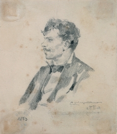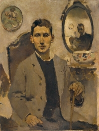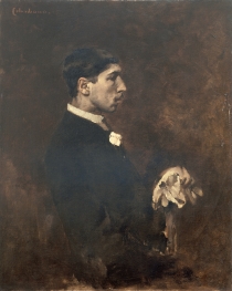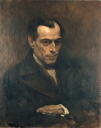 Executado no ano de regresso a Portugal, este primeiro retrato de Bulhão Pato apresenta, relativamente a obras anteriores, uma paleta bem mais clara em torno dos ocres. O claro-escuro dilui-se quase por completo. As pontuações matéricas dos quadros da fase parisiense generalizam-se a toda a superfície. O fundo claro, realizado através de uma mistura de ocre com salmão claro, permite recortar a figura mais escura. A mancha de contorno indefinido faz-se princípio absoluto, rejeitando a descrição em favor de uma planificação das várias manchas distribuídas por sobreposições ritmadas, sobretudo na zona inferior direita do quadro. O rosto e principalmente os olhos e o nariz contrastam com a diluição geral da composição, num desejo de reconhecimento do retratado – caução inevitável que o alheamento de uma certa modernidade por parte do artista jamais contornaria.