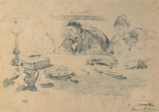 De 1878 datam os primeiros apontamentos de cenas de interior em que ele regista momentos do quotidiano da sua família, numa atmosfera de marcado intimismo. Dois desenhos captam este ambiente, com o pai, a irmã e uma criança, sentados à mesa. Num deles, c. 1878, as personagens dispõem-se de maneira a apoiar a linha de força que, marcada pelo contorno da mesa, atravessa a cena. O pai ocupa o centro, tal como a irmã, e ambos são caracterizados com mais pormenor, naquilo que parece ser um registo de volumes e sombras, assim como de definição espacial. O tratamento dos objectos – uma espécie de natureza morta no primeiro plano – e o sombreado na zona central da mesa assim o reafirmam.