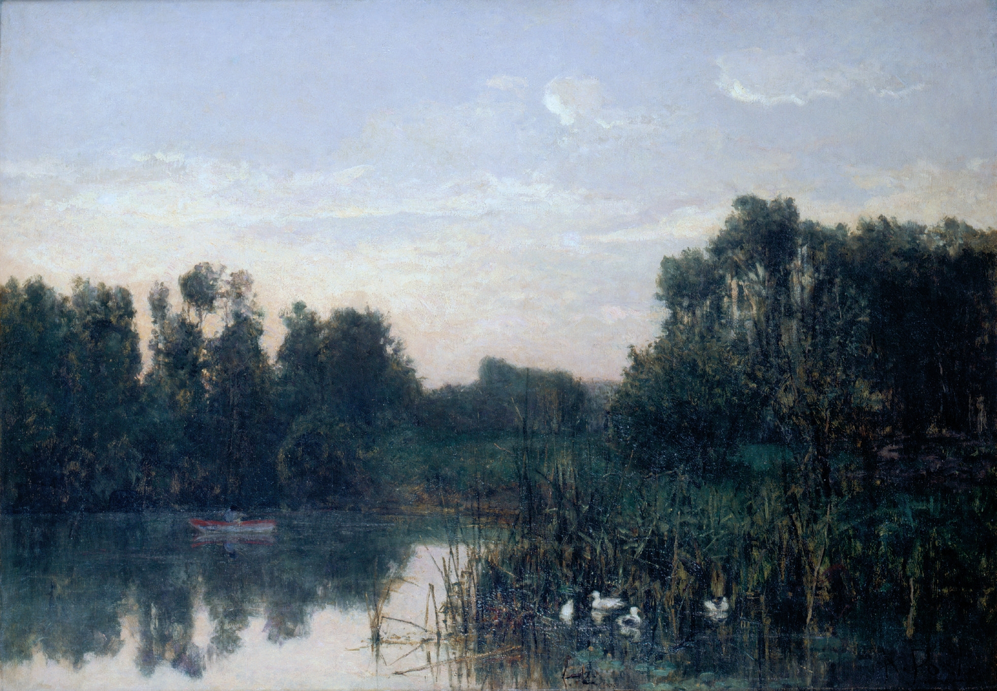 O Lago de Enghien foi oferecido por Silva Porto a Delfim Guedes, então Vice-Inspector da Academia de Belas-Artes e futuro conde de Almedina, por quem o autor foi sempre defendido. Realizado no período final do pensionato do artista em França, a influência de Daubigny é plena. Até o barco do segundo plano evoca a memória do barco-atelier do mestre. O contraste entre o céu claro e a penumbrosa mancha terrestre, que se ilumina com o reflexo das águas e onde o arvoredo se espelha, exprime uma poética do natural radicalmente nova na pintura portuguesa. A paisagem é entendida fora dos seus clássicos e “artificiais” conceitos de composição, para revelar a captação do espontâneo e fugaz, feito símbolo nas aves que pontuam a suspensão do instante, no primeiro plano. A pintura passa a ser entendida como a fixação dos muitos instantes de um percurso, e o instante a temporalidade própria do natural se fazer visível.
