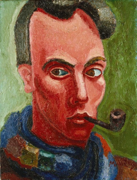 Desde inícios da sua trajectória que Mário Eloy adoptou a auto-representação como via de exteriorização subjectiva do mundo e dele próprio, avançando progressivamente o seu olhar sobre ele próprio de uma visão ingénua ou feliz na espontaneidade e amabilidade das cenas em que se inscreve, pacífica ou calma no seu classicismo construtivo, desconfiada e temerosa de um mundo que sente progressivamente mais agressivo, até chegar aos desenhos finais em que a violência e ameaça se concretizam em cenas desregradas e brutais. Este auto-retrato, o último que realizou na pintura, mantém relação com um outro realizado nos inícios da década de 30 no seu enquadramento, na pose, na sua conformação alongada, na iluminação superior do lateral direito e mesmo na valorização dos volumes. No entanto o tratamento cromático, que apoia nos violentos contrastes entre o verde do fundo e o carmim do rosto, mercê dos quais o rosto se destaca com força daquele, introduzem uma nota inquietante. Da mesma forma, o domínio de formas curvas que a aplicação da cor vem sublinhar, através de gradações tonais que multiplicam as linhas dos contornos em arrastadas e concêntricas pinceladas, em que a matéria cromática se adensa, confere uma outra violência e dramatismo. Mas será, sobretudo, o olhar oblíquo que se esquiva ao espectador que afasta o rosto do artista, impossibilitando o encontro entre ambos, e assim manifestando a inquietação e o isolamento do artista de um mundo que via desagregar-se aceleradamente à sua volta e prenunciando a queda final.